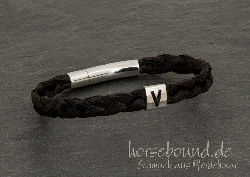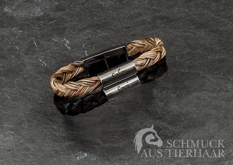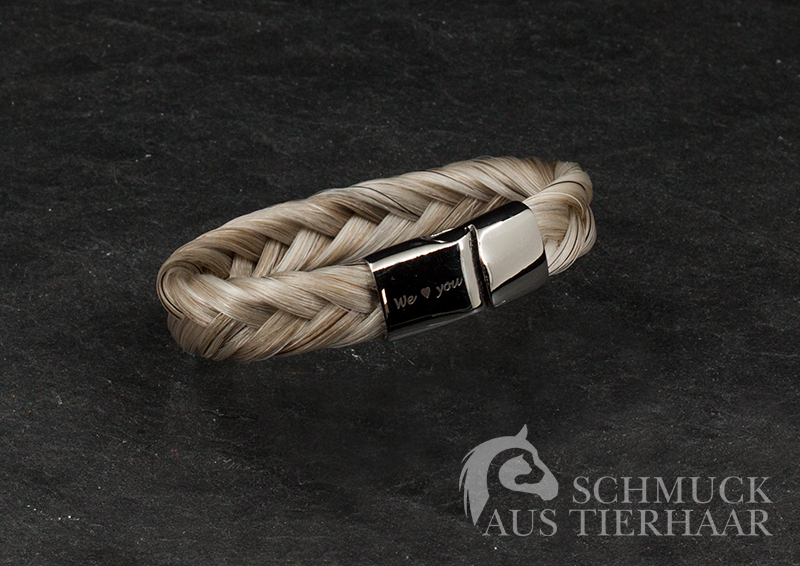 Bei breiten Armbändern bietet sich ein Edelstahl-Schilld (in unterschiedlichen Maßen erhähltlich) mit Lasergravur an, das auf dem Band vernäht wird.